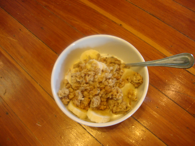 Chobani Champions Honey-Nana Greek Yogurt topped with a sliced banana and a big handful of Great Harvest granola.