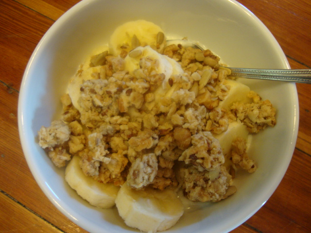 This breakfast has been on my mind ever since Kath handed me a sample of her chewy yet crunchy, salty yet sweet granola last week.