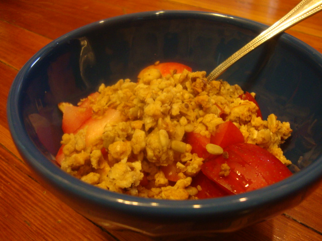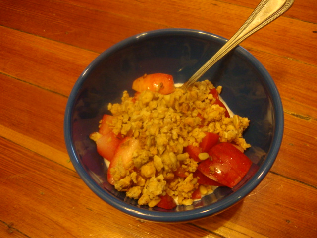 Instead of sliced bananas with my Chobani Champions Honey-Nana and GH granola, I used plucots.