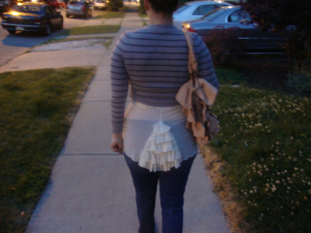 After we poured dinner down the train I was ready for bed, both in dress and energy level. All the food in the house required time to become meals and take-out was money we didn’t want to spend. So I threw a cardigan on over my nightgown and we headed to the Co-op. Which is how I ended up making my final walk down Elmwood (5 miles total for today!) in this –