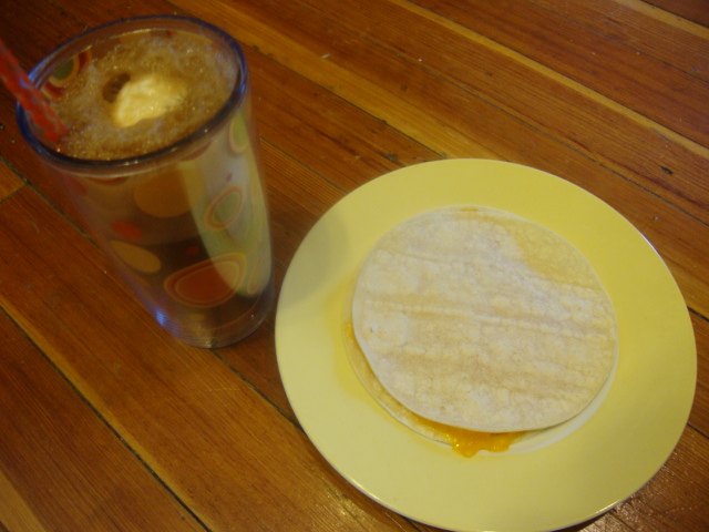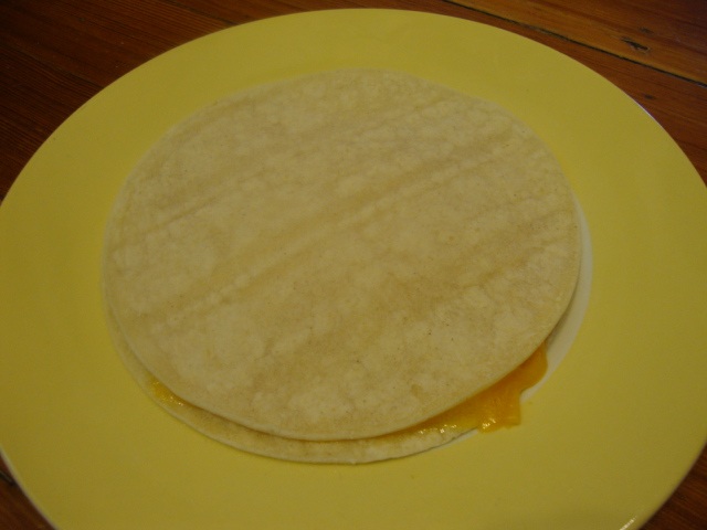 This afternoon I microwaved two mini corn tortillas with 2 slices of sharp cheddar to make a quick quesadilla.