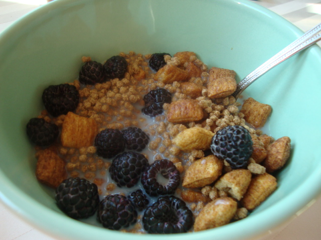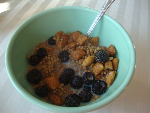 A serving of Cinnamon Puffins, a serving of All Bran Bran Buds, ultra-fresh black raspberries and skim milk.