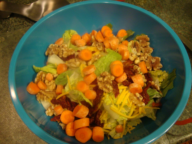 and tossed salad with romaine, walnuts, baby carrots, and sun-dried tomatoes.