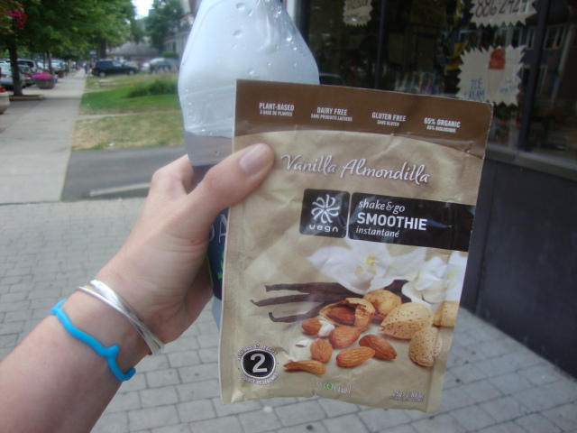 A Vega Vanilla-Almonde Shake and Go Smoothie packet that I grabbed from the co-op on a whim.  The flavor was good but not great, and this didn’t do an awesome job of sating my hunger, but I was definitely pleased with this –
