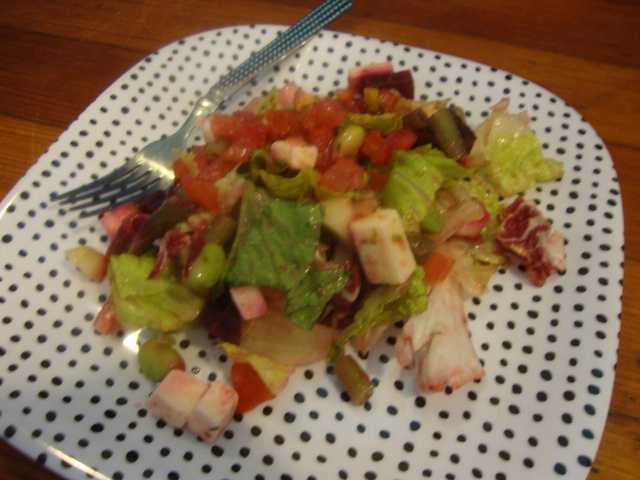 I dressed my leftovers from yesterday’s salad with Newman’s Own Light Caesar.