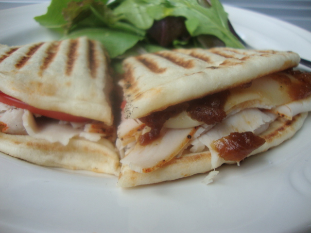 A turkey, mozzarella, tomato and caramelized onion panini,