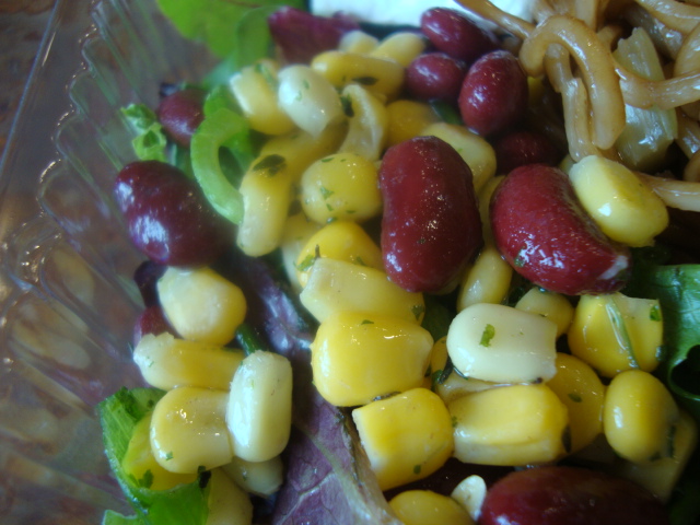 A spring mix lettuce base with tarragon vinaigrette, topped with a scoop of corn and kidney bean salad,