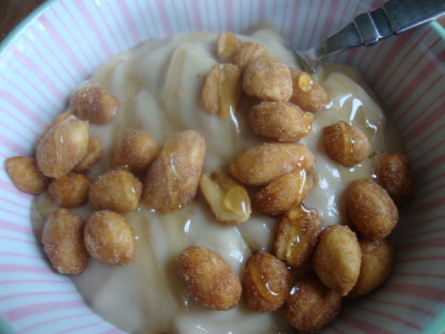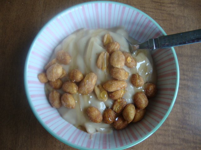 Low-fat coffee yogurt with 1oz of honey roasted peanuts and a drizzle of honey.