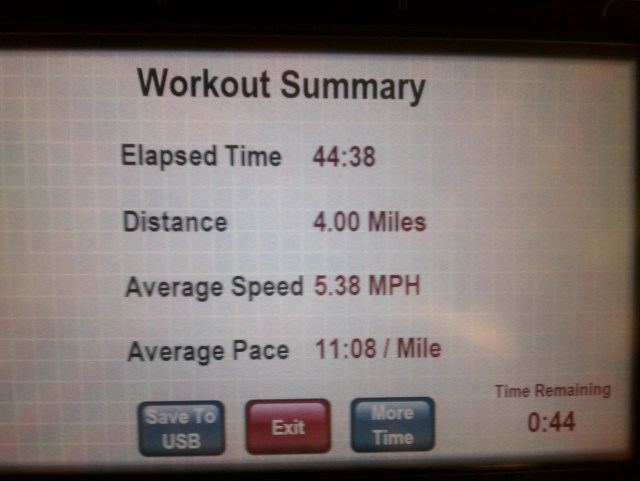 I did a 2 minute warm up followed by a “run” that ended up requiring a LOT of walking.  I’d prefer to take fewer breaks but considering that I basically took the summer off exercise I’m happy with any level of fitness.  Including my warm up and all of my walking breaks, I ran 4 miles in 44 minutes 40 seconds.