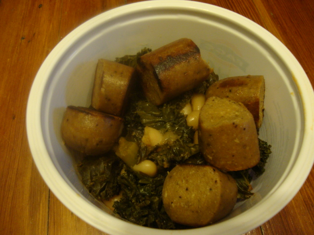 I had another class and then a break just in time for lunch.  I am going to post my class schedule but I’m waiting until next week so I’m sure it’s correct.  Lunch was simple but tasty.  Leftover bbq kale and beans, topped with Tofurky kielbasa.