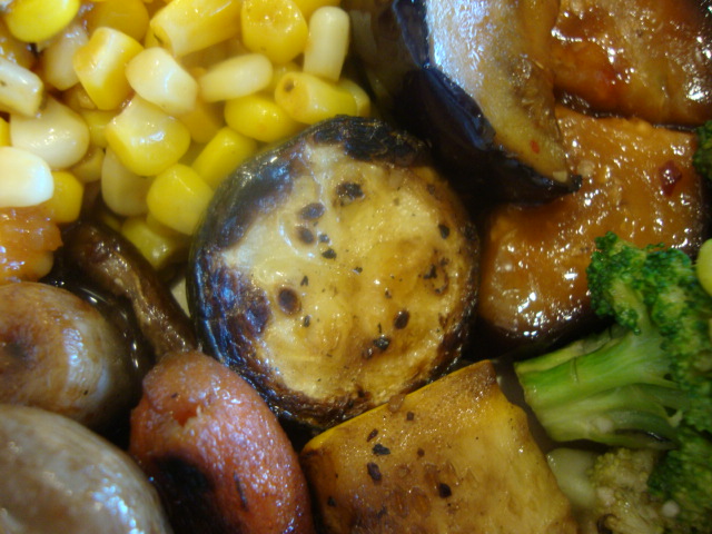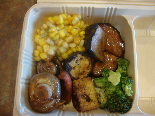 Southwestern corn salad, chili garlic eggplant, sautéed broccoli, and roasted squash and mushrooms.