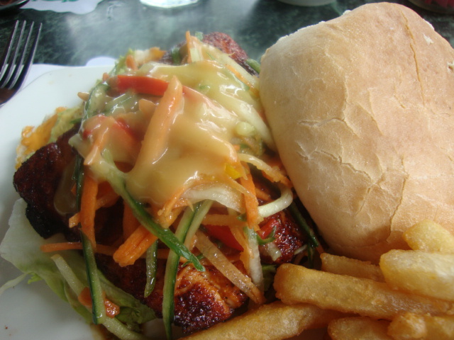 A sandwich of grilled salmon in a sweet glaze with pickled veggies, and french fries.