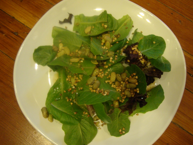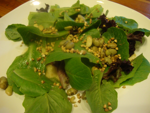 A romaine base with Newman’s Own Light Cesar, roasted edamame, and roasted buckwheat groats.