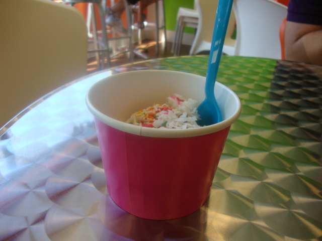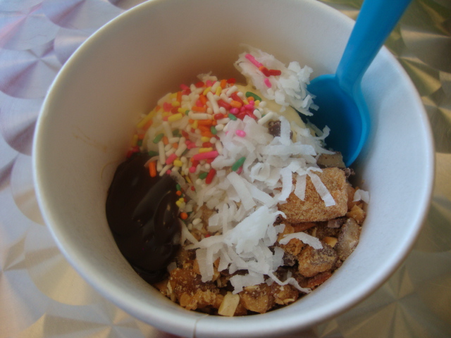I got ~ 1/2 cup of cake batter and dulce de leche swirl, topped with butterfinger, skore, coconut, sprinkles, and hot fudge.