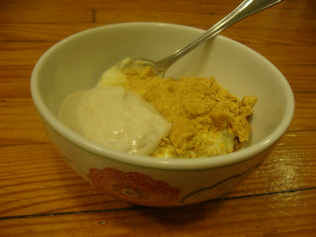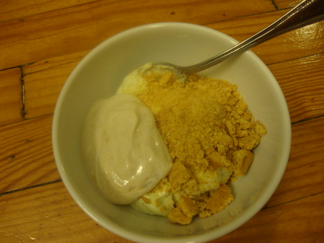 Plate bowl the yogurt.  Whisk together sour cream and sugar in a separate bowl.  Crumble graham crackers on top of yogurt.  Top with sour cream.