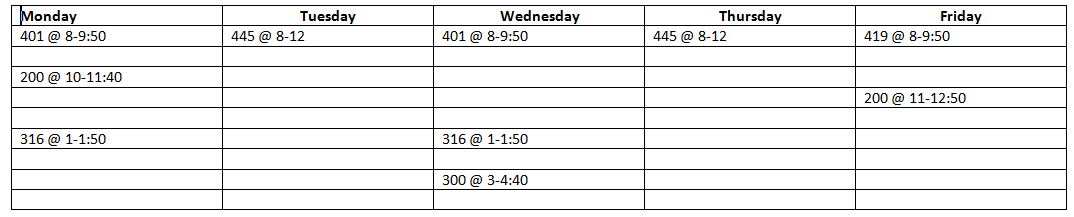 This breakfast doesn’t have all that high of a calorie or protein content (13 grams, I checked that too) but hopefully it will help to carry me through me long day.  For those of you who asked, Mom, here is my school schedule for this semester –