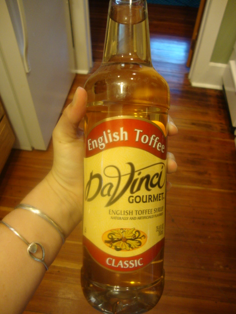 Adam brewed me coffee last night and I stashed it in the fridge in a glass jar; all I’ll have to do in the mornings is add ice and skim milk. This cup was extra exciting because I also added 1 Tbsp of English Toffee syrup.
