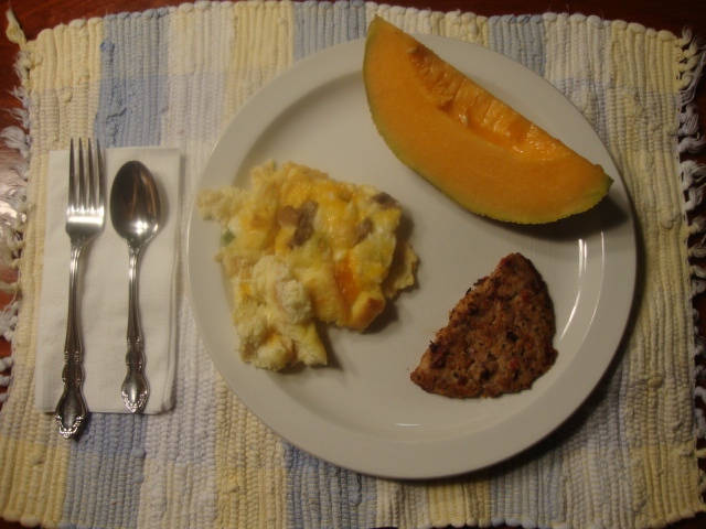 and a delicious egg casserole with mushrooms, cheese, and bread cubes.