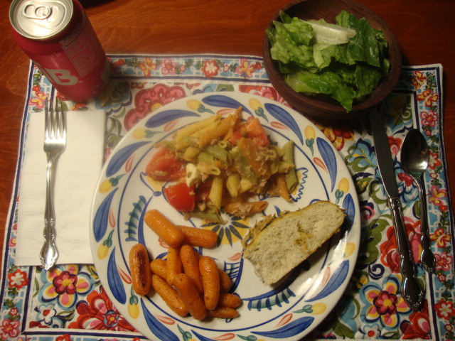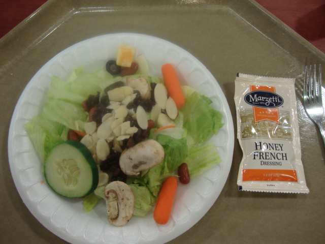 I filled a plate at the salad bar with lettuce, a few kidney beans, black olives, almonds, and mushrooms, and some honey French dressing. Not bad.