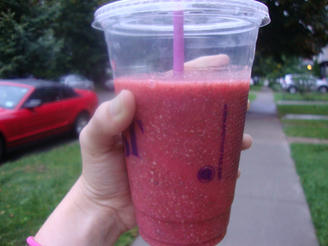 I know it doesn’t look like much but this new combination was freaking amazing. I put 1 cup of lemonade and 2 Tbsp of chia seeds in my blender and left them to soak. Five minutes later I added 1 cup of frozen strawberries and then blended like crazy. Here’s an outside picture so you can really see the color –