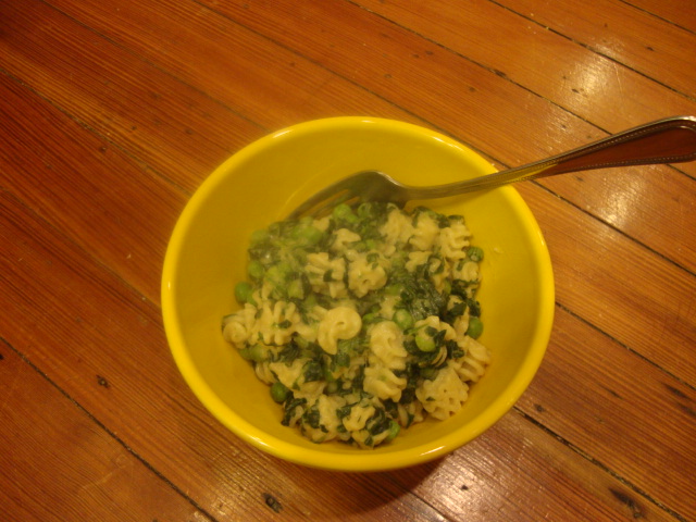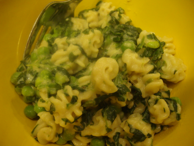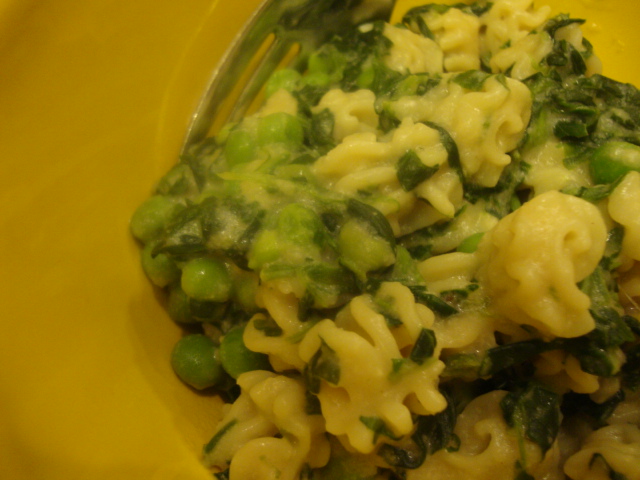 I prepared 2 servings of spirals pasta, stirring frozen spinach and peas into the mix in the last few minutes of boiling. Then I made Emily’s Nutritional Yeast Sauce and tossed everything together.
