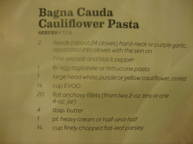 Bagna Cauda Cauliflower Pasta from last month’s Everyday with Racheal Ray. The recipe isn’t online yet so I can’t link but here is a shot of the ingredients –