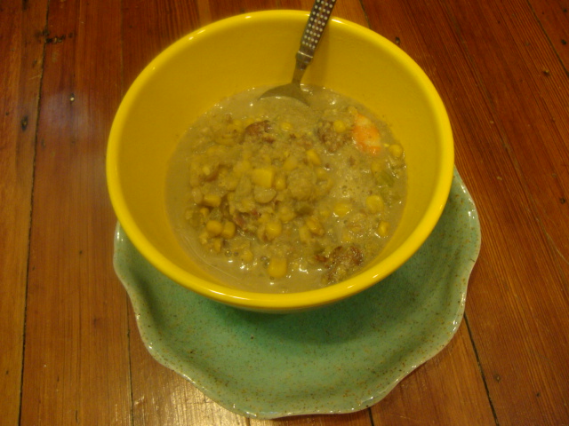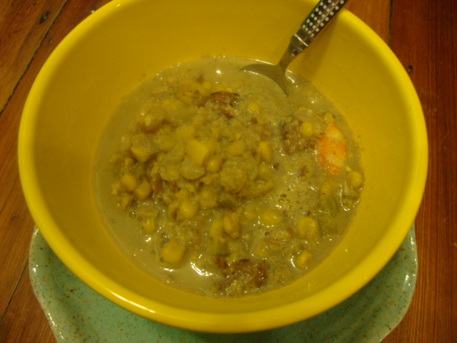 I went unorthodox for breakfast because I found the last serving of bacon, corn, and shrimp chowder lurking in the back of the fridge.