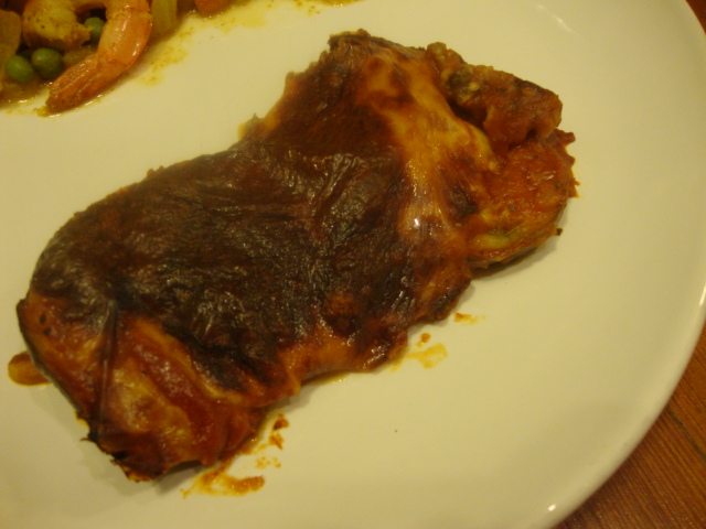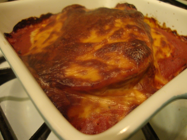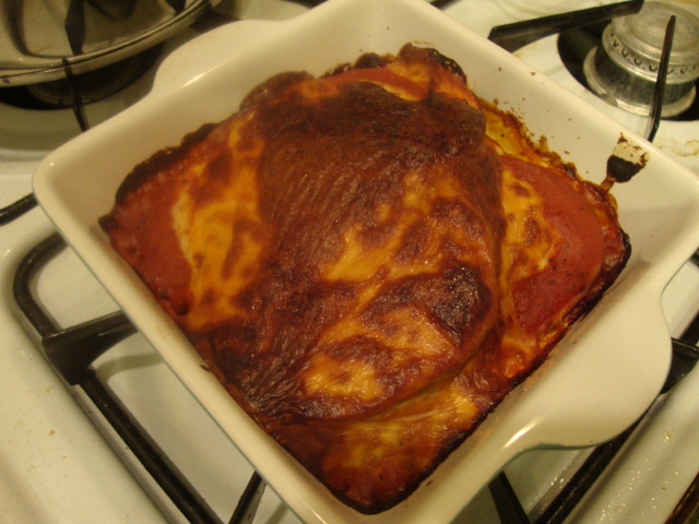 For two – into my mini casserole dish went a thin layer of marinara, a layer of thinly sliced eggplant, a sprinkle of salt, a thick layer of marinara, and 2 slices of 2% provolone cheese. Baked at 450* for 45minutes.