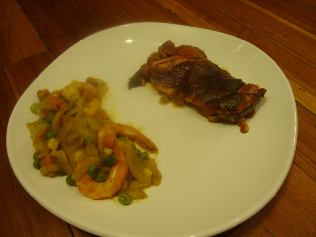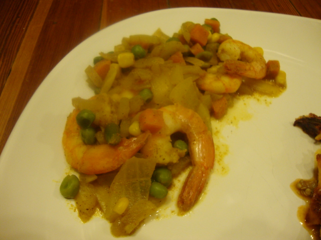 On the left is a small serving of Cooking Light‘s Bombay Shrimp Curry. My changes to the recipe included using ground mustard instead of mustard seed, skipping the cilantro, and using a veggie mix with peas, corn, carrots, lima beans, and green beans. I also skipped the rice because I had just eaten pasta.