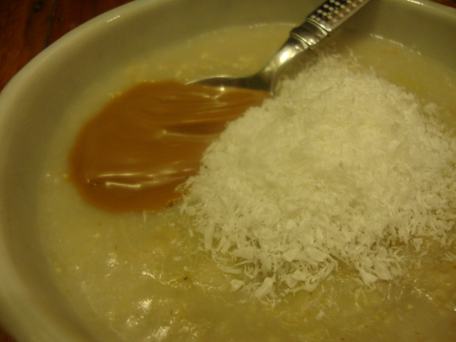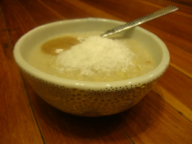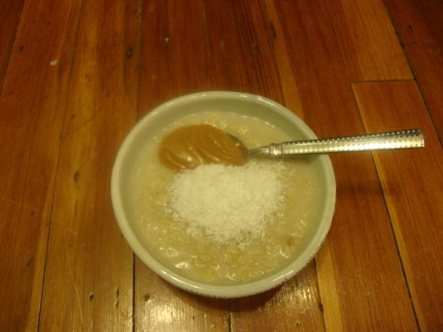 I boiled 2/3 cup light coconut milk (plus 1/4 cup of water) and stirred in 1/3 cup oats and 1 medium banana.