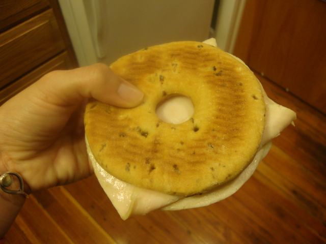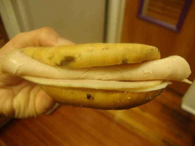 The turkey was delicious and the sweetness of the bagel totally made the sandwich.
