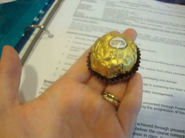 I also packed a baggie of baby carrots but they were so slimy I couldn’t even eat them. Thankfully my friend Rachel realized that we were burning through our glucose stores cramming for the exam and she bought us Rochers.