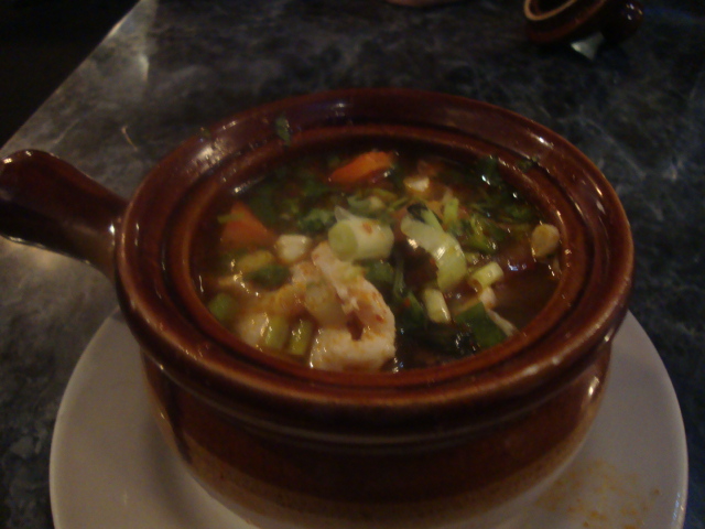I stole several bites of Adam’s Tom Yum soup. The famous Thai soup, slightly sour and spicy with fresh mushrooms, tomato, chili, lemongrass, galangal, and lemon juice with cilantro, scallions, and chicken.