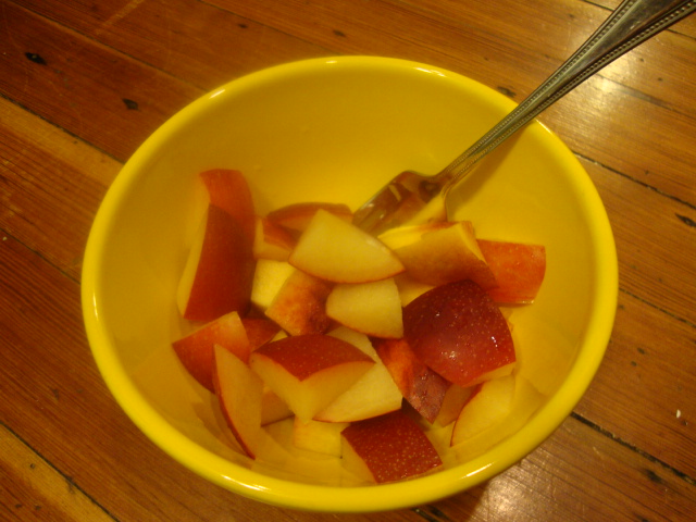 A yellow nectarine and a red plum.