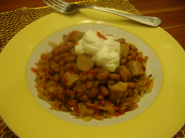 Let’s be real though, I loved this meal!  I topped ~3/4 cup of apple cider cabbage leftovers a serving of hot dogs and beans, topped with a dollop of 0% plain Greek yogurt and lots of drops of Sriracha.