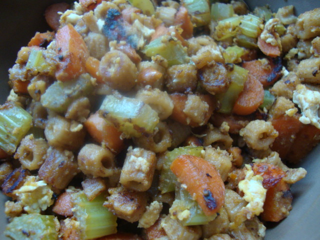 1. In a large skillet, cook veggies in broth until liquid is gone and veggies are adequately softened.