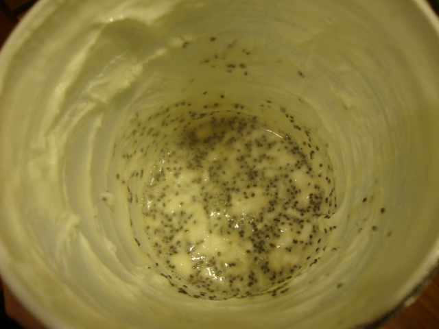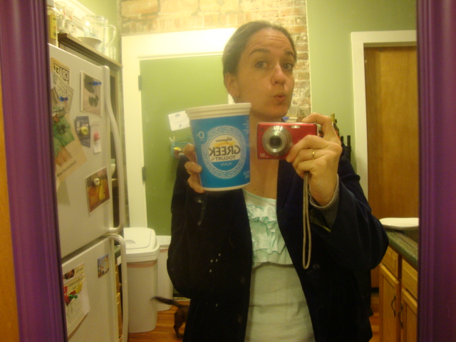 Yesterday morning did get off to a good start with a yogurt bowl.  Into the last ~ serving of Wegman’s 0% Greek yogurt I stirred 1 Tbsp chia seeds, 1 Tbsp maple syrup, and 2 Tbsp Silk Plain Almond Milk.