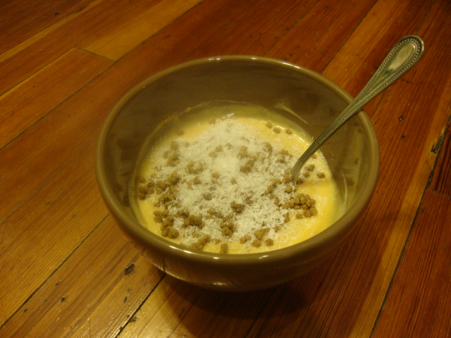 I mixed a Stonyfield Low-Fat French Vanilla Yogurt with pumpkin pie spice and 1/4 cup of canned pumpkin, then topped with 1/4 cup of All-Bran Bran Buds and 1 Tbsp unsweetened coconut.