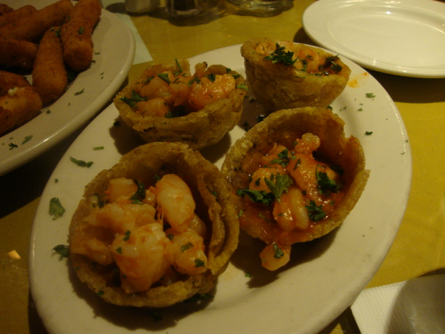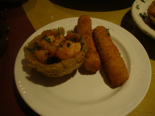 Fried plantain with shrimp in red sauce and mozzarella sticks.
