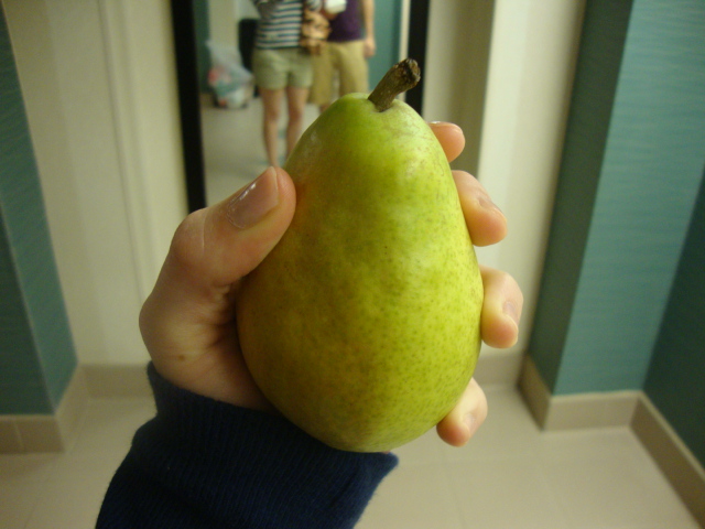 I ate my stolen pear for breakfast.