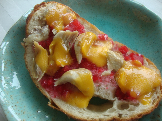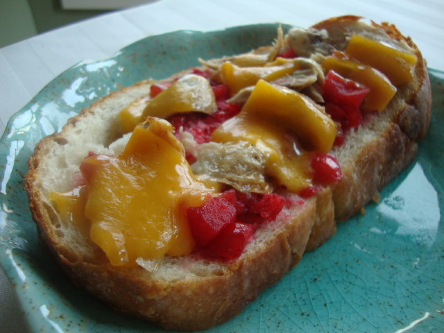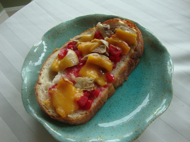 This open-faced sandwich was stupendous. I topped a thick slice of bread with cranberry relish, some shredded rotisserie chicken, and a few slices of melty sharp cheddar.
