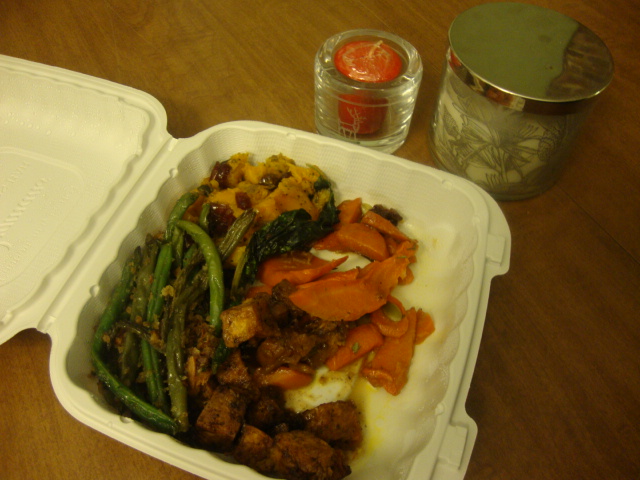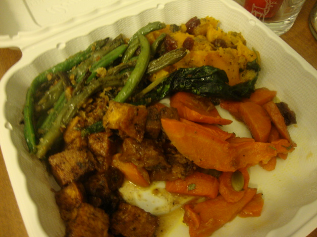 One of the veggies (potatoes, I think) had a thick, sweet sauce that leaked over everything and tied the whole plate together. Yum.