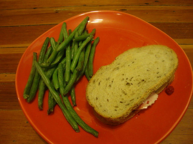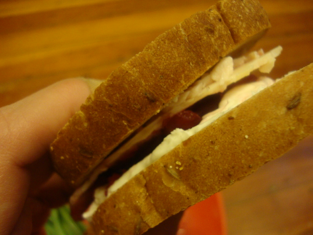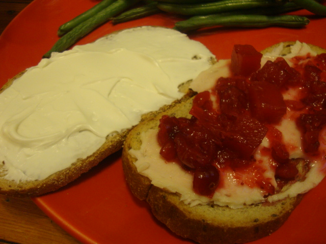 My amazing turkey sandwich was 2 slices of toasted rye with cranberry relish, 2 slices of Applegate Farms roasted turkey, and 1 oz of reduced fat cream cheese.