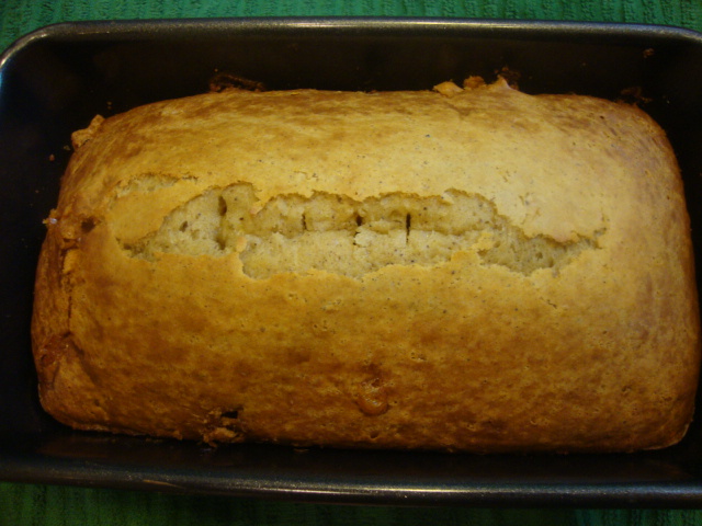 4. Pour dough into a greased loaf pan and bake for 45 – 50 minutes, until top is browned and an inserted knife comes out clean.