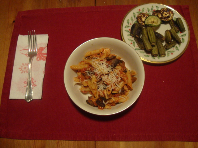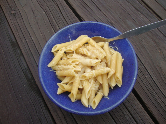 I also ate a leftover serving of whole wheat penne with 1.5 tsp of olive oil, a shake of salt, and a sprinkle of parmesan.