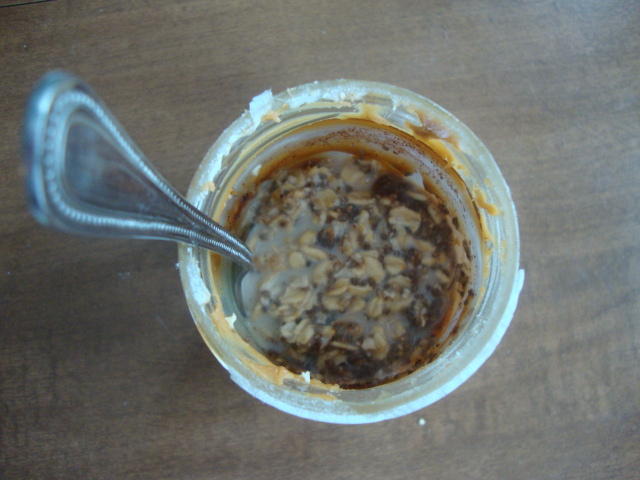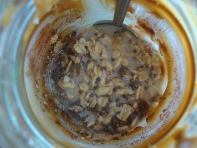 Last night I combined 1/3 cup oats, 1/3 cup skim milk, 1 Tbsp chia seeds, and 1 dash cinnamon with the last 1 Tbsp or so of Biscoff left in the jar.