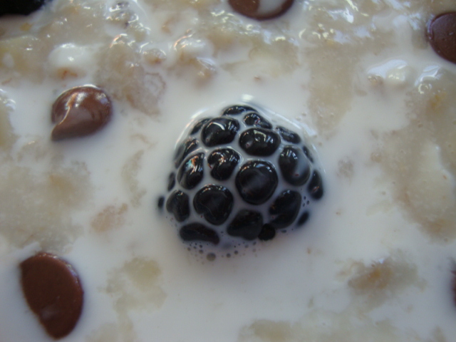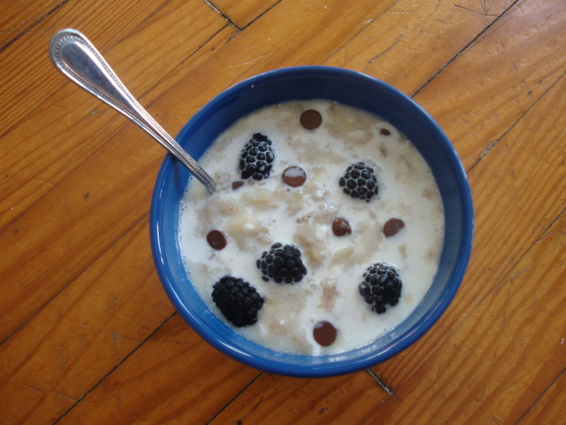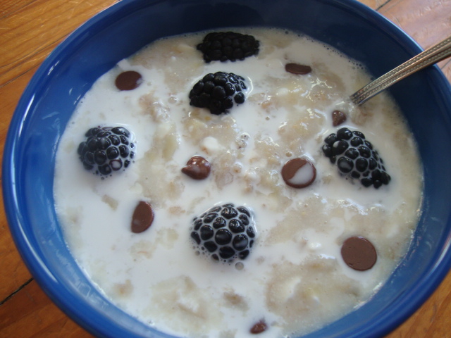 1/2 cup each skim milk and water, 1/4 cup oats, a pinch of salt, 1 small banana, 1/4 cup low-fat cottage cheese, blackberries, a sprinkle of milk chocolate chips, and a drizzle of light half and half.