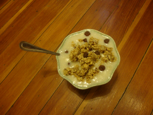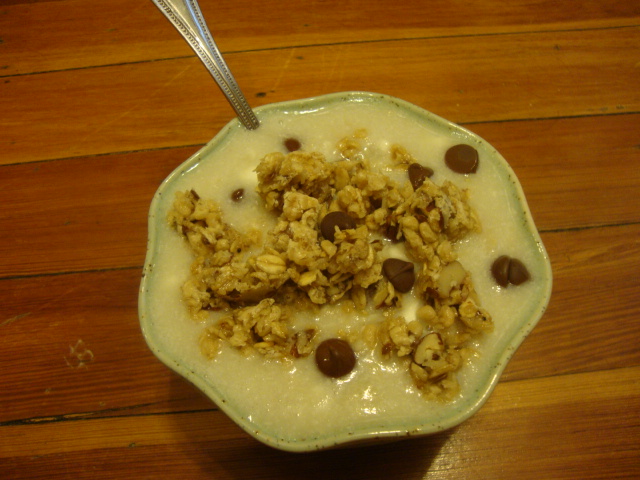 Topped: a chopped Nature’s Path MMMaple Pecan granola bar and a handful of milk chocolate chips