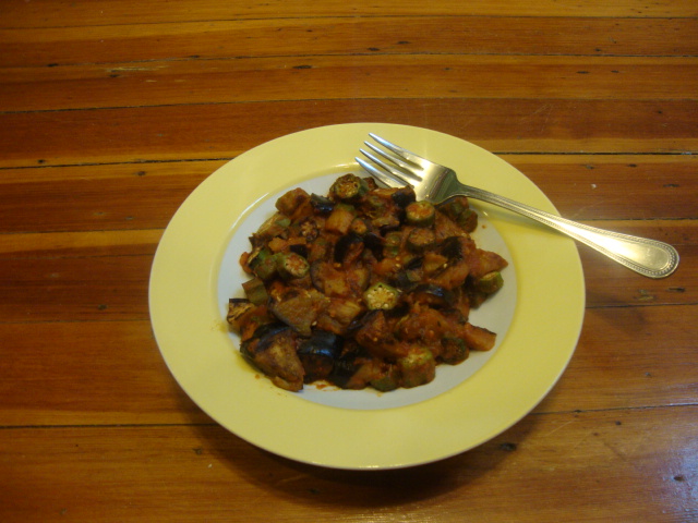 I chopped up half a large eggplant and sautéed it in a little evoo and chipotle oil, then poured in some water and covered it to steam. Then I added in a big handful of chopped okra and ~ 1/2 cup of marinara sauce.