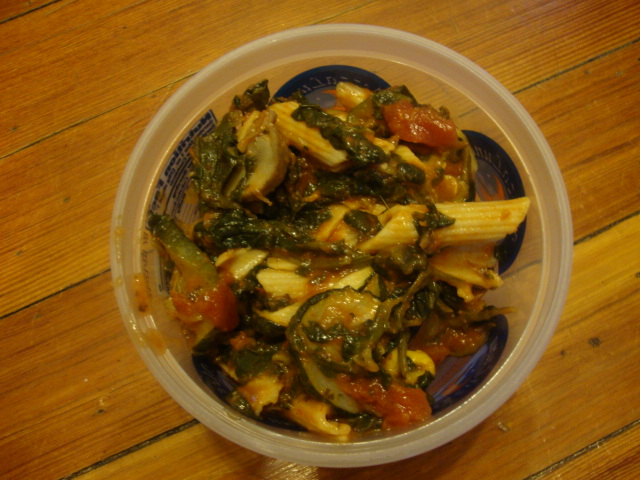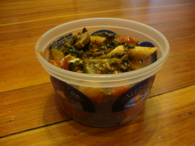Holy frick I love reusing containers so much  I over-served Adam’s lunches for this week so that reused cheese container held a half serving he’d left behind.  In the mix was penne pasta, roasted zucchini and yellow squash, sautéed mushrooms, spinach, diced tomatoes, marinara sauce, and a drizzle of olive oil.